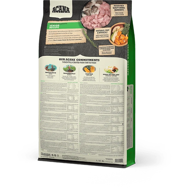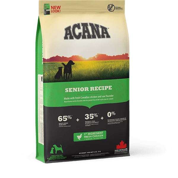 When it comes to ACANA food for dogs, every ingredient matters. That’s why our Senior Recipe is thoughtfully crafted to help nurture your mature or senior dog. Rich with 65%* quality animal ingredients like fresh Canadian chicken and raw flounder balanced with 35% fruit, vegetables & botanicals, this recipe provides a balanced diet that will help maintain the health of your senior dog. With quality animal ingredients balanced with fruit, vegetables and botanicals delivered daily, every meal of ACANA Senior Recipe is like it came from the farmer’s market.