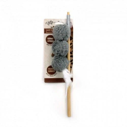 The kebab wand is composed of sturdy wood with a long nylon rope attached. Three kebab fluff balls will give your cat an assortment of targets to tackle. On the end ball is a vivid and life-like bird feather that will be sure to catch your pet’s eye.