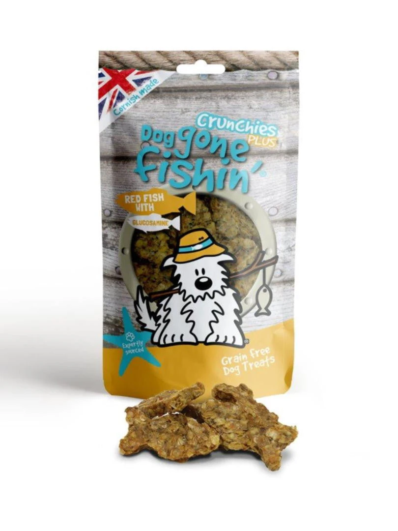 Dog Gone Fishin’ Red fish with Glucosamine Crunchies are delicious crunchy fish treats with the added benefits of Glucosamine, which aids joint mobility. These deliciously crunchy fish treats are a healthy snack, reward or training treat for your dog.