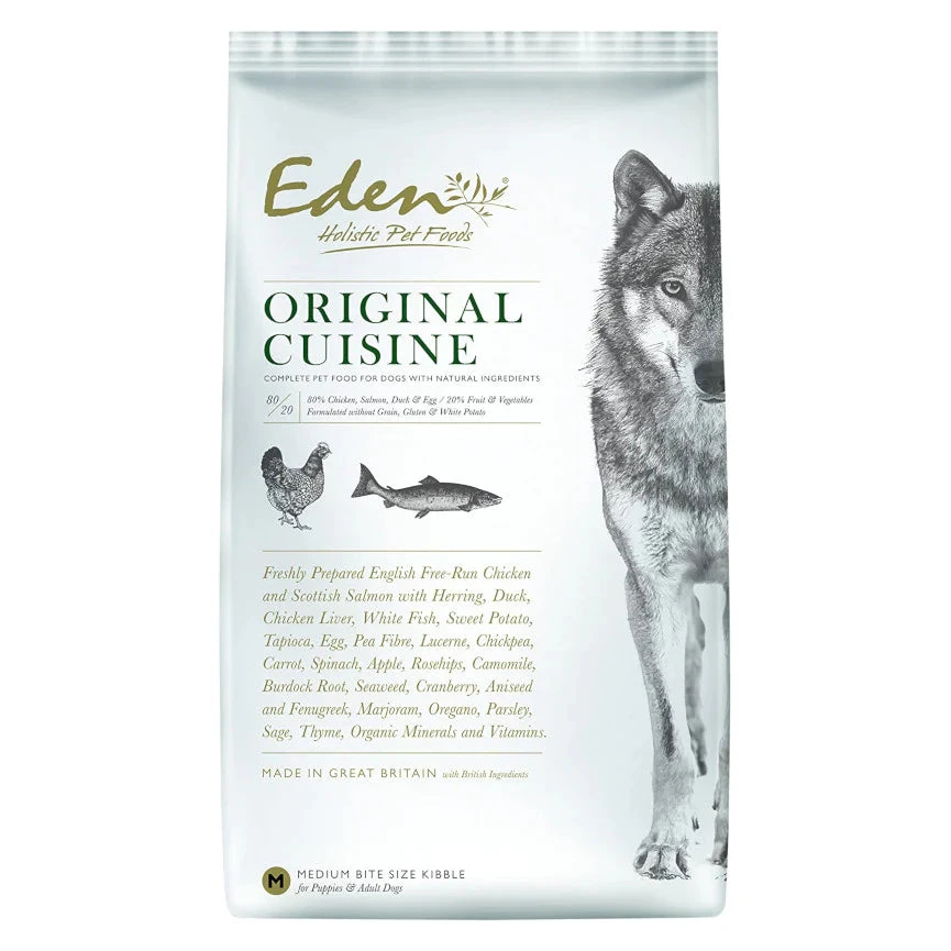 Based on the natural ancestral diet of your dog, with a high content of quality animal protein aligned to a dog’s natural food intake, Eden 80/20 Original Cuisine Complete Adult Dog Food is made using only the finest, freshly prepared English free run Chicken, Scottish Salmon, North Atlantic Herring, traditionally reared Suffolk Duck and whole egg.