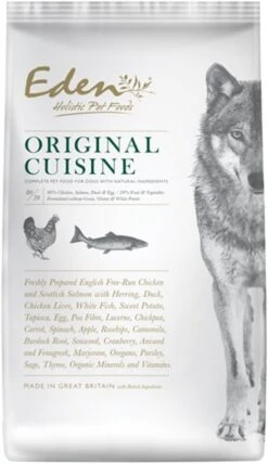 Freshly Prepared Chicken (19%), Dried Chicken (18%), Freshly Prepared Salmon (15%), Dried Herring (12%), Dried Sweet Potato (11%), Chicken Fat (4.5%), Dried Duck (4%), Tapioca, Dried Whole Eggs (2.5%), Chicken Liver (2.5%), Freshly Prepared White Fish (2.5%), Pea Fibre, Lucerne, Chickpea Flour, Minerals, Dried Carrot, Dried Spinach, Dried Apple, Dried Rosehips, Camomile Powder, Burdock Root Powder, Dried Seaweed, Dried Cranberries, Dried Chicory Root Extract (as a source of Fructo-oligosaccharides (Prebiotic FOS; 0.04%/480 mg/kg)), Glucosamine (0.03%/355 mg/kg), Methylsulphonylmethane (0.03%/355 mg/kg), Chondroitin Sulphate (0.02%/250 mg/kg), Aniseed, Fenugreek, Thyme, Marjoram, Oregano, Parsley, Sage.