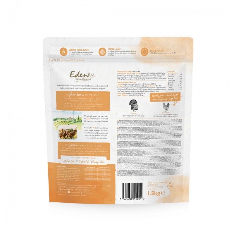 70% Turkey & Chicken (Including 36% Dried Chicken, 30% Freshly Prepared Turkey, 4% Turkey Fat), Potato 11.5%, Peas 5.5%, Lentils 3.5%, Chickpea 3.5%, Liver Gravy, Salmon Oil, Cellulose (1%), Minerals, Vitamins, Fructooligosaccharides (480 mg/kg), Mannanoligosaccharides (120 mg/kg), Dried Cranberry 0.01% Yucca Extract