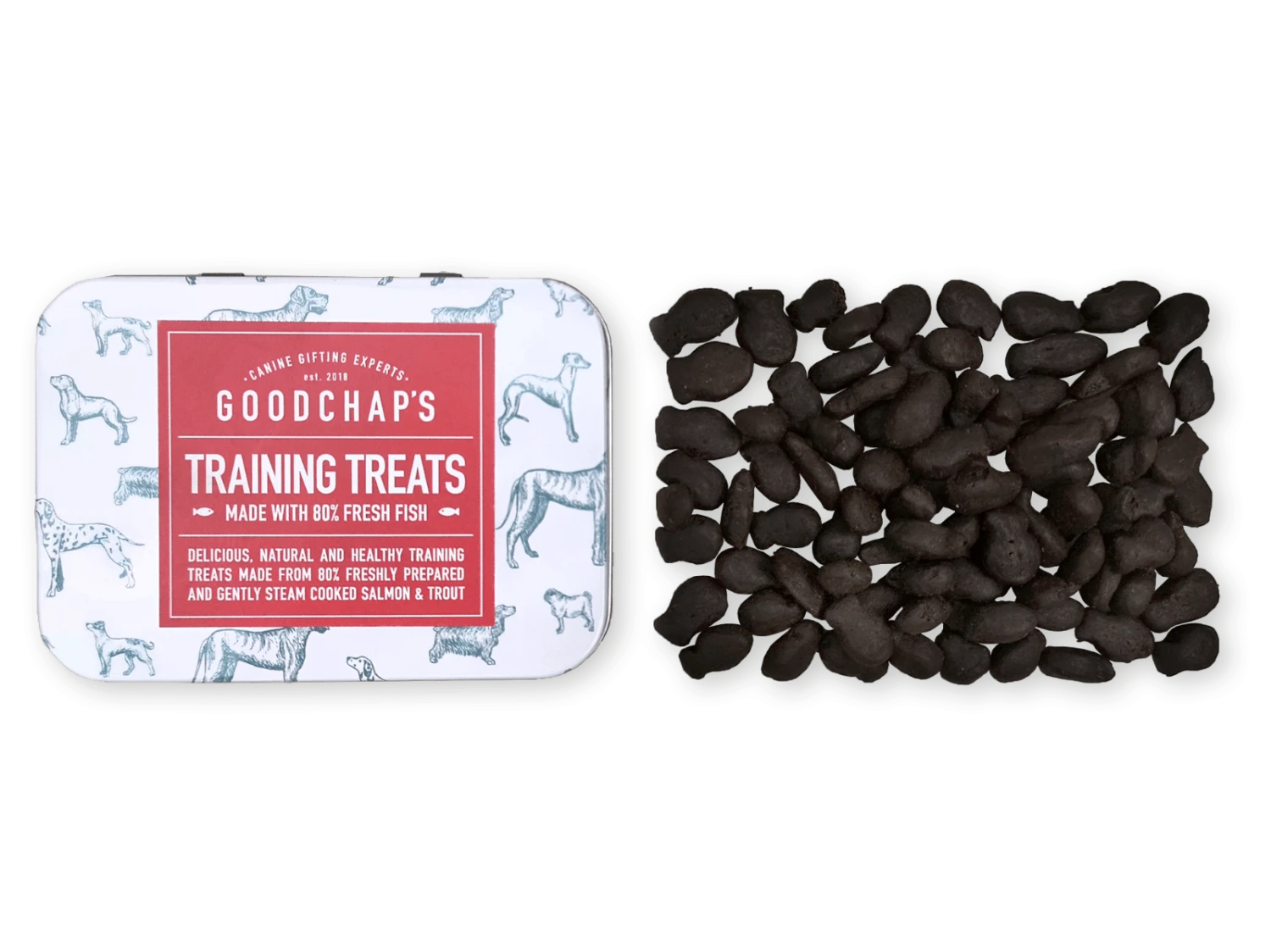 This handy refillable tin is great for training, filled with delicious, natural and healthy training treats made from 80% freshly prepared and gently steam cooked salmon & trout. The rest in potato – both sweet and white.