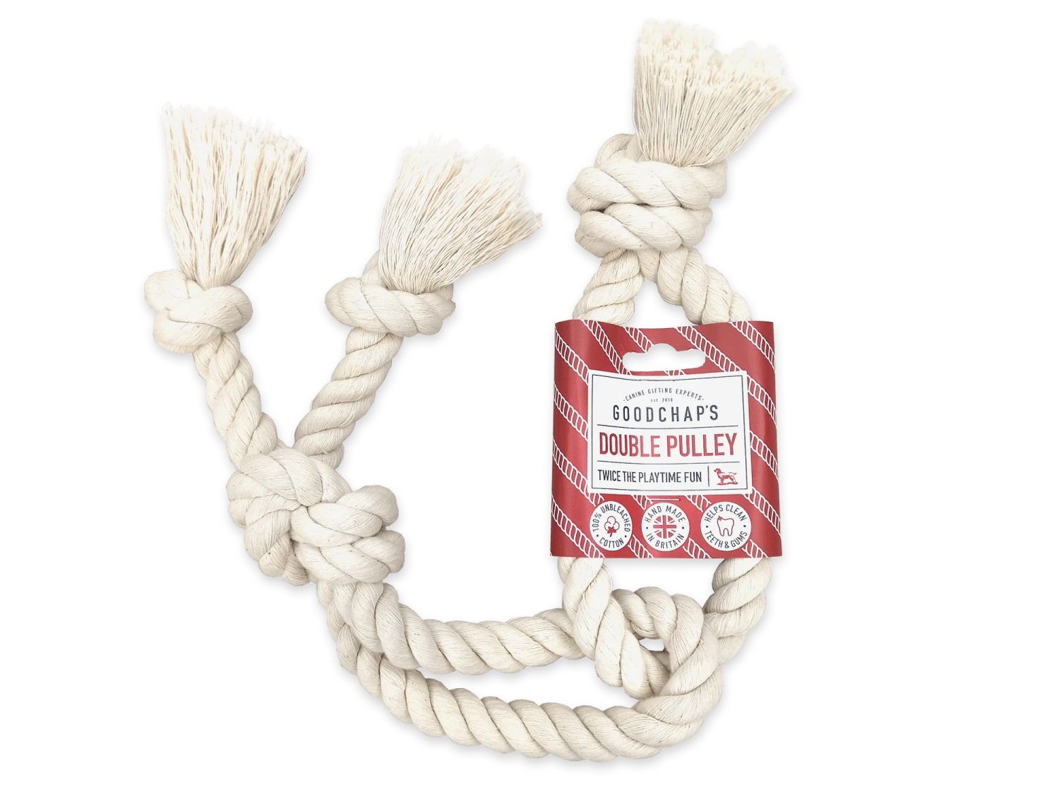 Handmade in Britain, this double pulley rope toy is tough and durable, but no chew toy is indestructible. Your dog should always be supervised while playing with any chew toy, and chew toy time should be limited to 15 minutes a day. Always remove any toy if parts become loose or damage occurs.