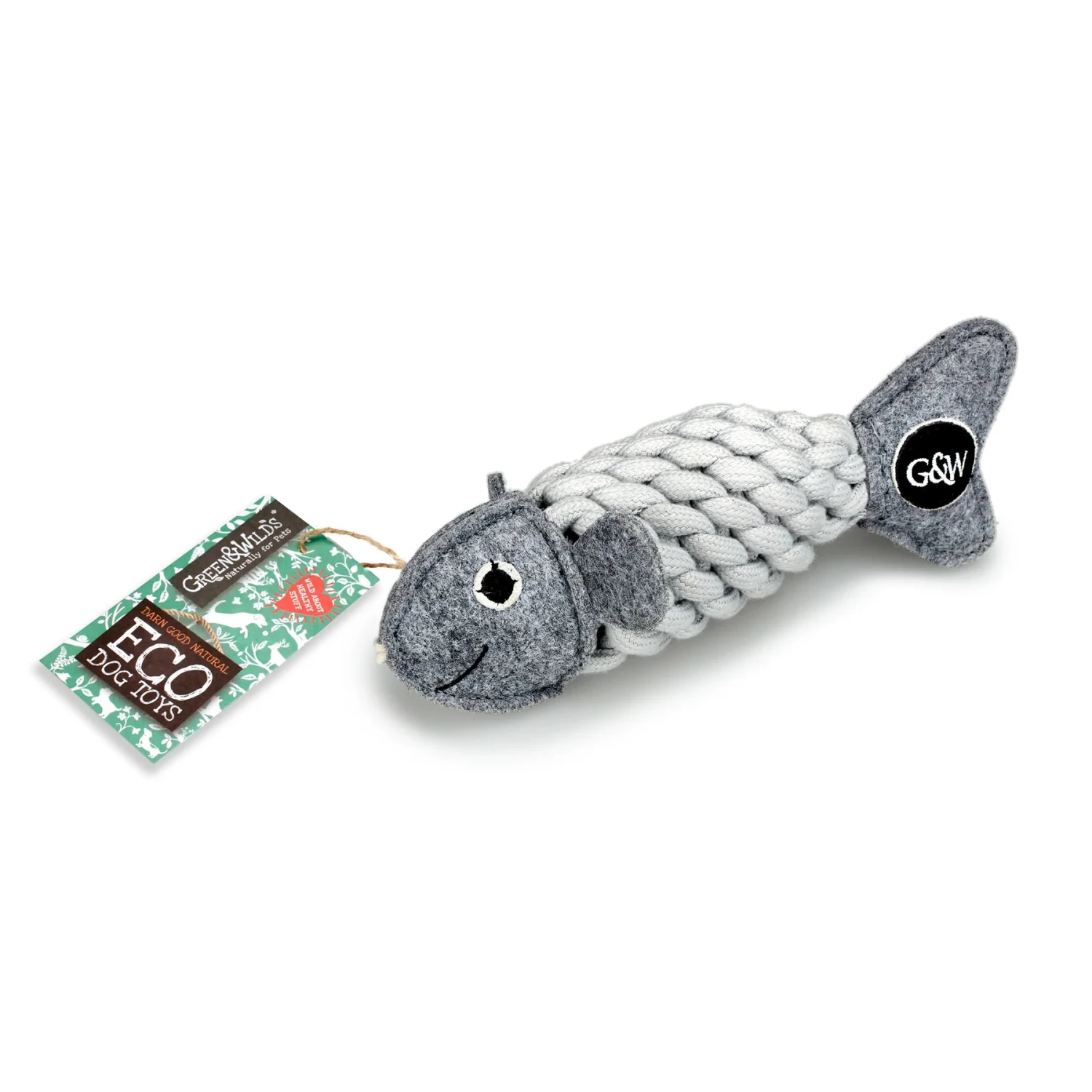 In muted shades of grey, he is composed from a felt head, flippers and tail, with a recycled plastic bottle covered in braided jute rope. Jute is a natural, sustainable plant fibre. The suede used for his eye is a by-product and ensures that this material is not wasted. Tough and long lasting, made without using any compound that would harm or be released when chewed. Jute is 100% biodegradable.ย