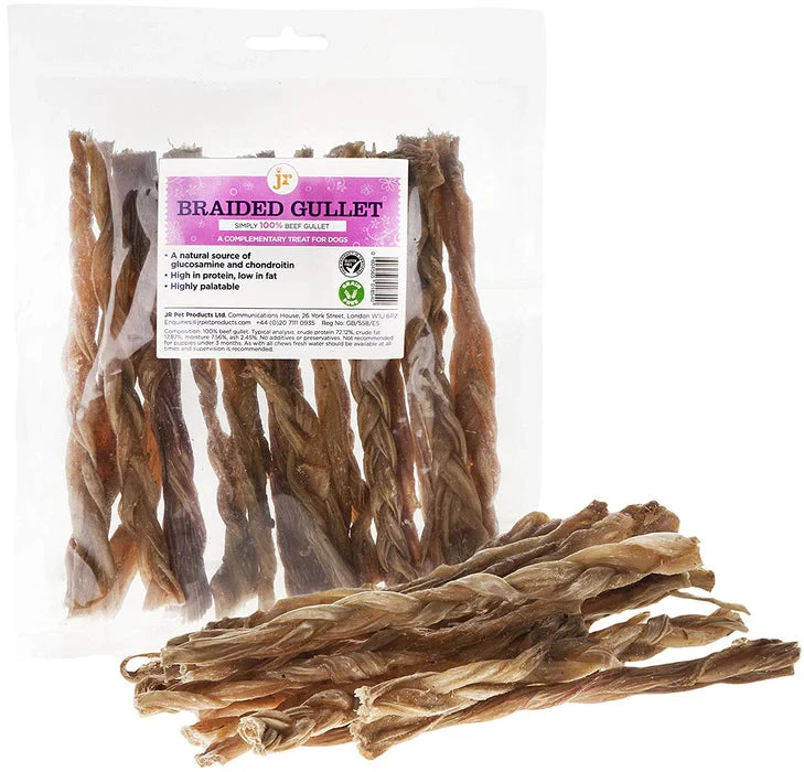 Our Braided Beef Gullet are made from 100% Beef Gullet. Simply Air-dried with No additives, No Preservatives, Nothing! High in Protein and Low in Fat our Braided Beef Gullet is highly palatable and is a softer alternative to our traditional Pizzle chews so these are great for dogs of all ages. A Natural source of Glucosamine & Chondroitin, these chewy treats are great for promoting good Teeth and Gum health.