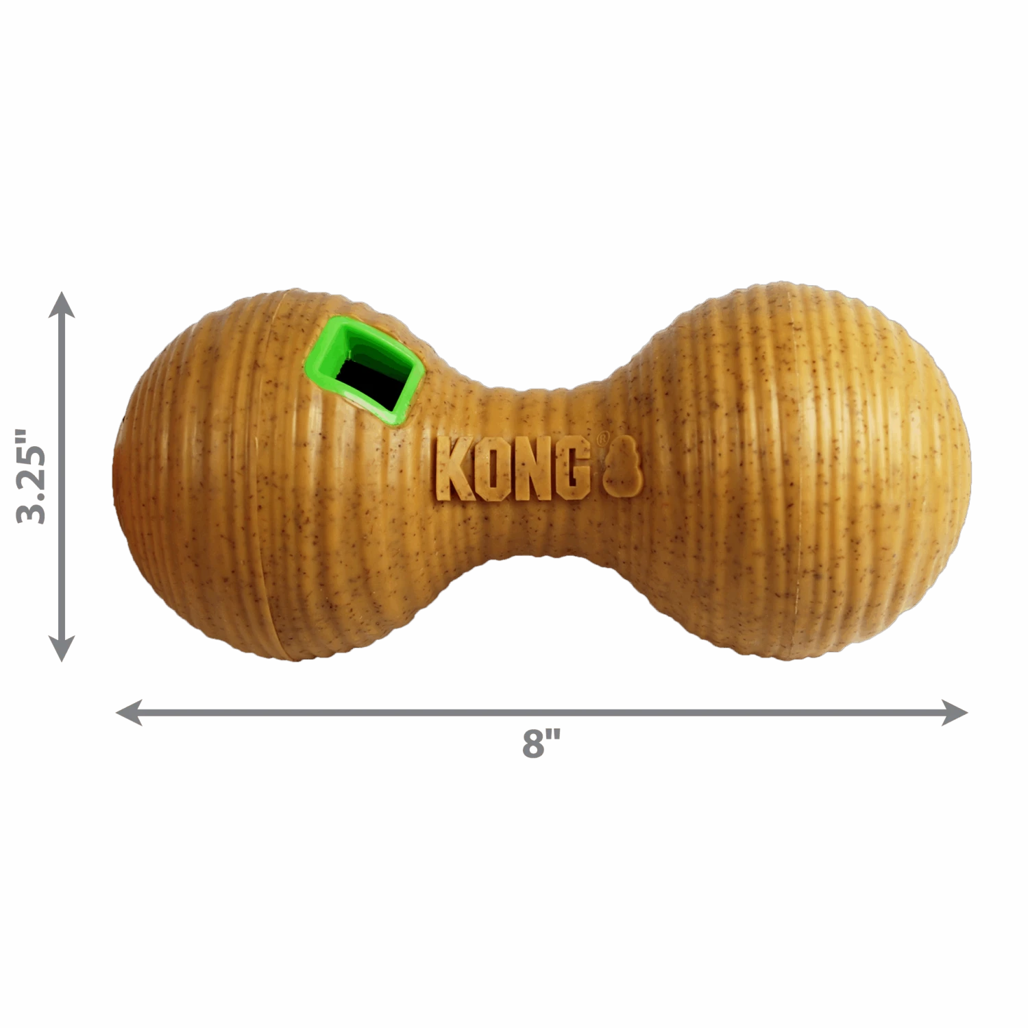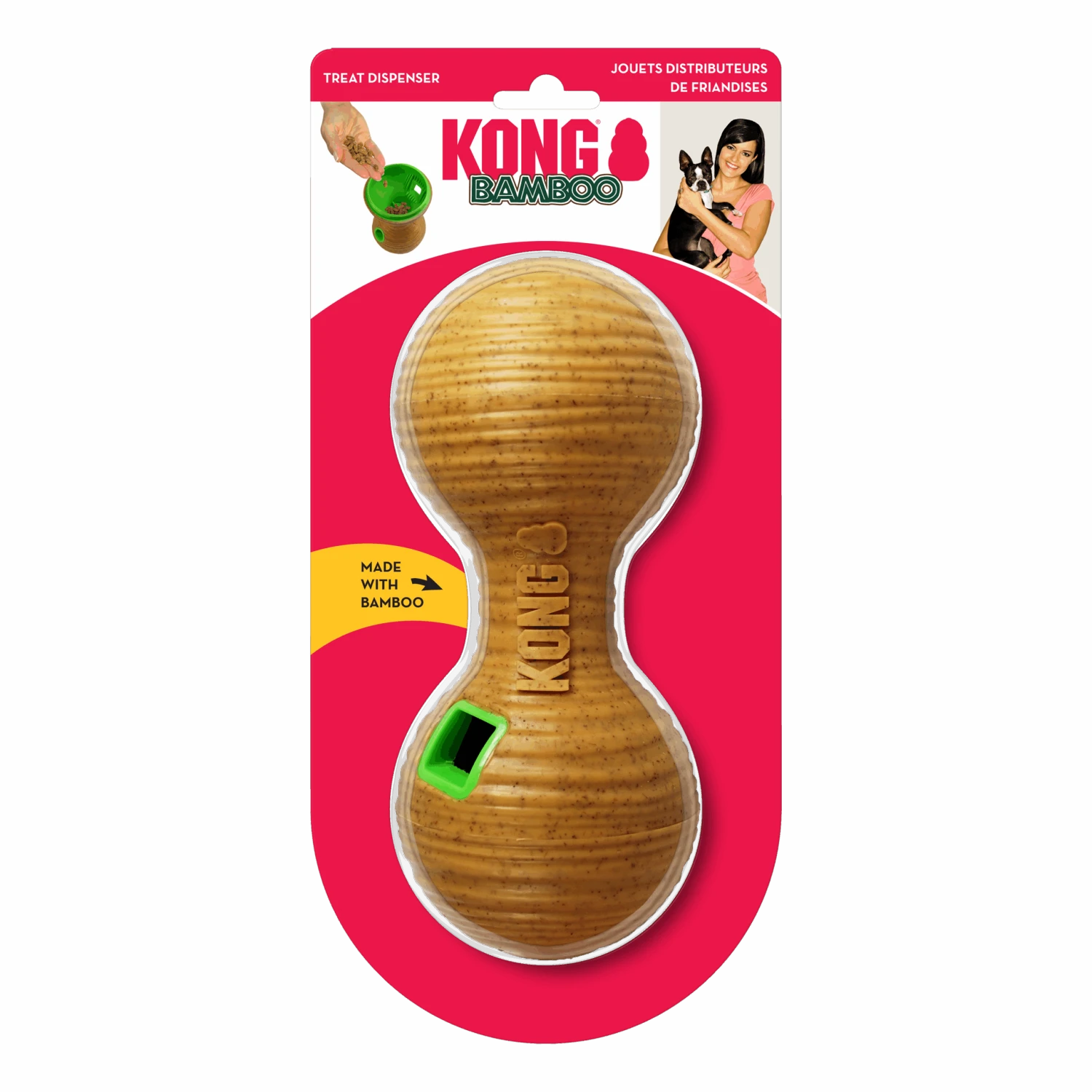 Twist open and fill with kibbles or treats and the irresistibly unpredictable way KONG Bamboo dispenses snacks hooks dogs into extended bouts of play that busies body and mind. Use for kibbles at mealtime to slow eating and help with weight management. A natural twist (and roll) on interactive dog toys, the durable, bamboo-infused material mutes noise for quieter play sessions.