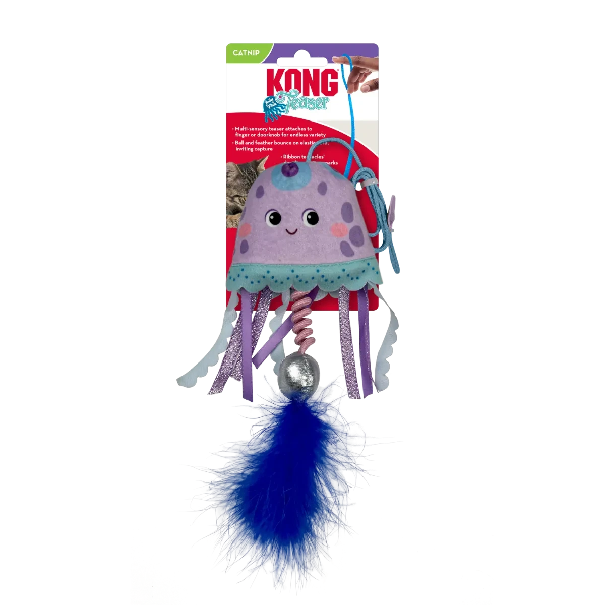 KONG Jellyfish Teaser’s a multi-sensory bundle of instinct-satisfying play that attaches to a finger for interactive adventures—or a doorknob or handle for solo “undersea” exploits. Ball and feather bounce on elastic cord, inviting capture while irresistibly dangling ribbon tentacles entice batting. Bell, crinkle and KONG North American Premium Catnip prolong play.