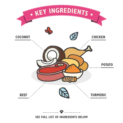 Potato, Glycerin, Tapioca, Freshly Prepared Beef 10%, Cooked Chicken 5%, Cellulose, Coconut 0,5%, Sodium Bicarbonate, Turmeric 0,1%. Additives: Technological Additives: Antioxidants (tocopherol extracts from vegetable oils).