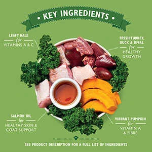 61% Freshly Prepared: Turkey (41%), Duck (20%), Sweet Potatoes (4%), Pumpkin, Kale (2%), Cranberries, Organic Potatoes, Organic Carrots, Vitamins & Chelated Minerals, Salmon Oil (0.5%),Botanicals & Herb: Golden Rod, Nettle, Aniseed, Celery Seed, Rosehips, Marigold Petals, Cleavers, Seaweed, Alfalfa, Milk Thistle, Dandelion Root, Burdock Root