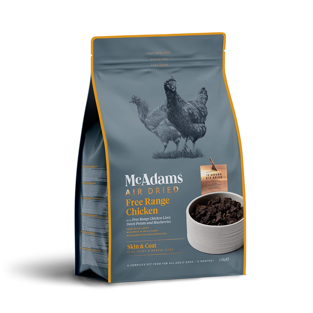 Delicious and luxurious, McAdams Air-Dried Free-Range Chicken is a natural and complete dog food designed to support and nourish the skin.