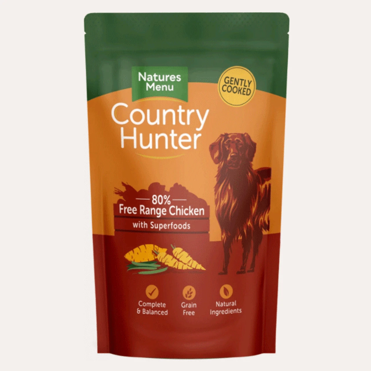 Natures Menu Country Hunter Free Range Chicken complete and nutritionally balanced meal made with 80% responsibly sourced, free range chicken and a generous portion of delicious fruit and vegetables, including sweet potatoes, mixed berries and carrots.