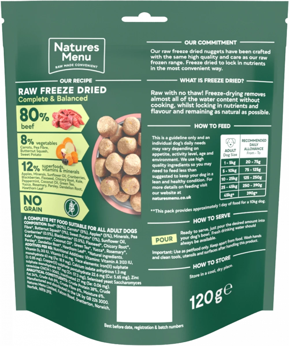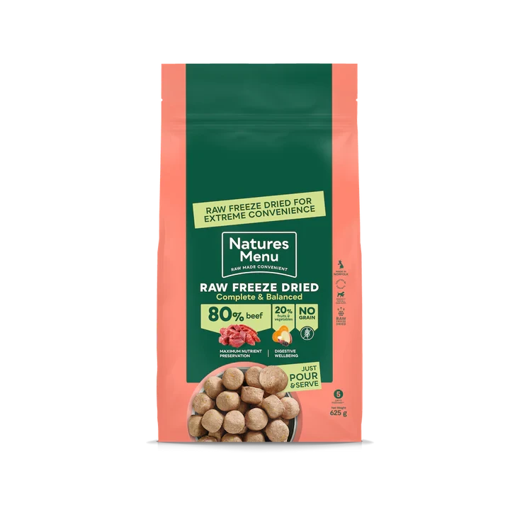Delicious Complete and Balanced Freeze Dried dog food, made with 80% quality beef, combined with fruits, vegetables and superfoods. Perfect for adult dogs of all sizes. Our Freeze-Dried complete meals are designed to meet all of dog’s nutritional needs, helping support digestive wellbeing, without the need for frozen storage or defrosting.