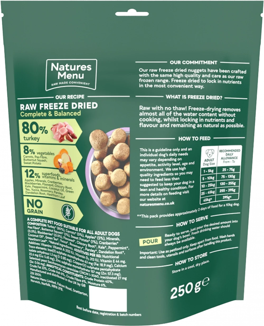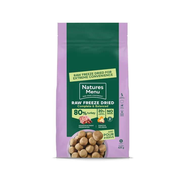 Delicious Complete and Balanced Freeze Dried dog food, made with 80% quality turkey, combined with fruits, vegetables and superfoods. Perfect for adult dogs of all sizes. Our Freeze-Dried complete meals are designed to meet all of dog’s nutritional needs, helping support digestive wellbeing, without the need for frozen storage or defrosting.
