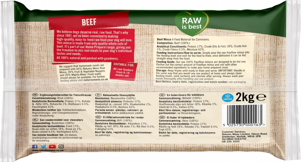 Just Beef Raw Freeflow Mince is an ingredient, not a complete meal. Add it to other ingredients to make balanced and nutritious raw meals at home.