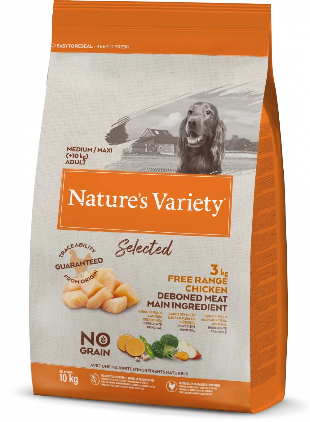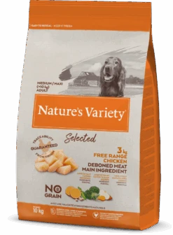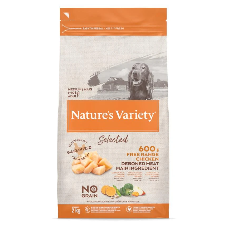 Nature’s Variety Selected for medium and large-size dogs (10kg+ body weight) is a complete and balanced dry dog food with a difference. Its high-meat recipe features quality, deboned free range chicken as the main ingredient, with a blend of wholesome fruit, vegetables and botanicals, with no artificial flavours, colours or preservatives and no grain – just quality, natural ingredients that are rich in nutrients to support your dog’s health and wellbeing.