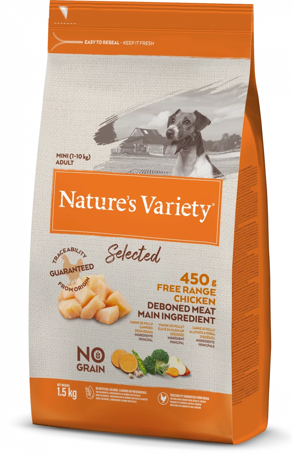 Nature’s Variety Selected dry dog food for small dogs (Mini, 1kg-10kg body weight) has been specially developed with vets for smaller dog’s dietary needs, and with smaller bite-size pieces for littler mouths.