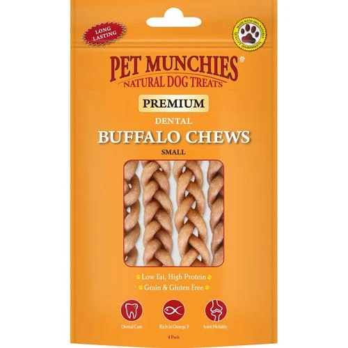Premium gourmet dental chews made with 100% natural human- grade grass fed Buffalo. This healthy chew is infused with salmon oil which is good for skin and coat, joint mobility due to the rich levels of Omega 3. Long lasting and designed to satisfy your dog’s natural instinct to chew, to help reduce tartar and plaque for healthy teeth and gums to support good oral health. Grain and gluten free. Low in fat, high in protein, with no artificial colours or flavours makes this the ultimate chew.