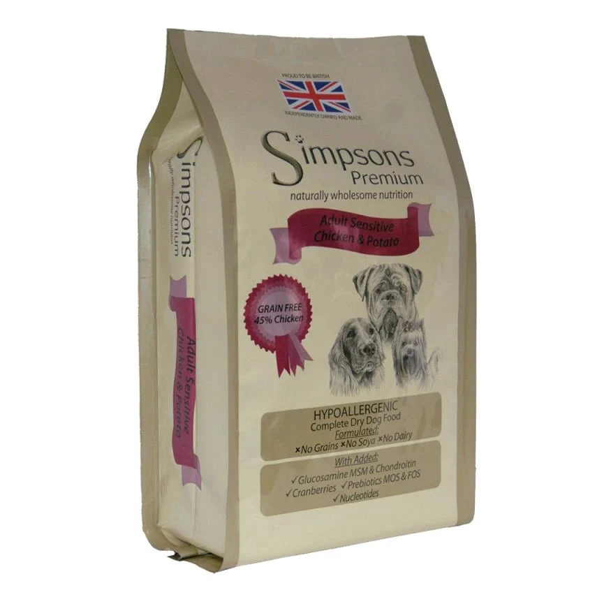 Simpsons Premium Adult Sensitive Dog Food Chicken and Potato is a diet designed with your dog’s health in mind. Its grain-free formulation is ideally suited for supporting adult dogs with sensitive skin and/or delicate digestion.