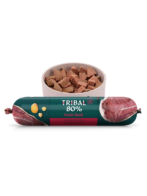 These Tribal 80% Sausage – Duck gourmet sausages are a complete wet dog food and contain 73.5% muscle meat and 6.5% organ meat using duck from responsibly raised farms in the UK. The muscle meat, which consists of de-boned duck and duck heart provides the protein and essential amino acids that every dog needs. You can feed this delicious sausage to your dog on it’s own or add it to dry kibble.