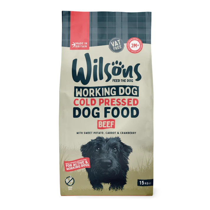 Available in 15kg eco packs, our Beef Cold Pressed Working Dog Food is a complete grain free British dry food for working and active dogs, and is gently pressed with sweet potato, carrot and turmeric in our Scottish factories.