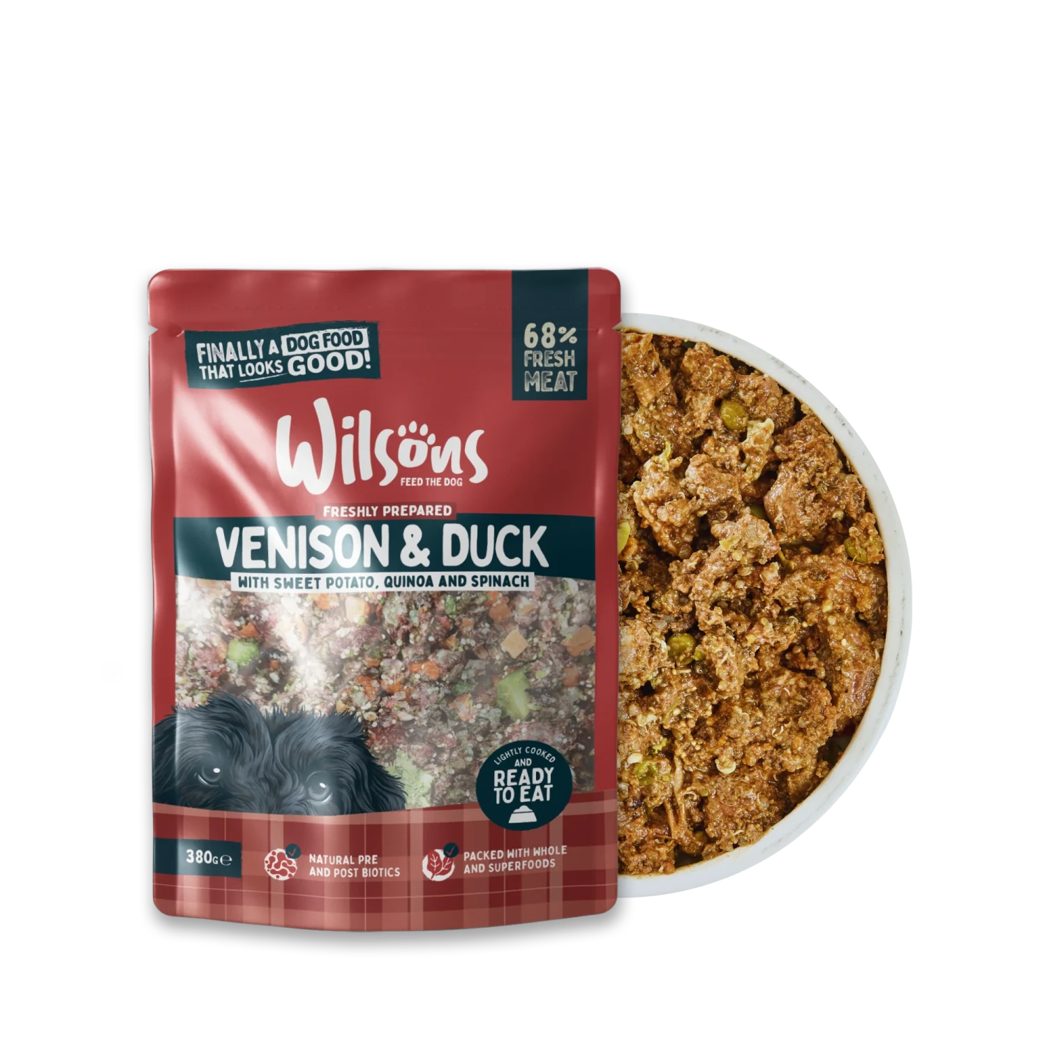 Venison (58%), duck (10%), sweet potato (10%), quinoa (8%), peas (7%), spinach (3%), minerals and vitamins (1.3%), egg shells (1%), sunflower oil (1%), seaweed (0.5%), chicory (0.13%), DL-methionine (0.015%), mannan-oligosaccharides (0.015%), inulin (0.013%), glucosamine (0.012%), chondroitin sulphate (0.009%), yucca schidigera (0.0075%), natural antioxidant – rosemary and tocopherol extracts (0.0045%), selenium yeast (0.0032%), thyme (0.0030%), carnitine (0.0015%), cranberry (0.0015%) dandelion root (0.0015%), marigold yellow (0.0015%), ginger (0.0015%), turmeric (0.0015%).